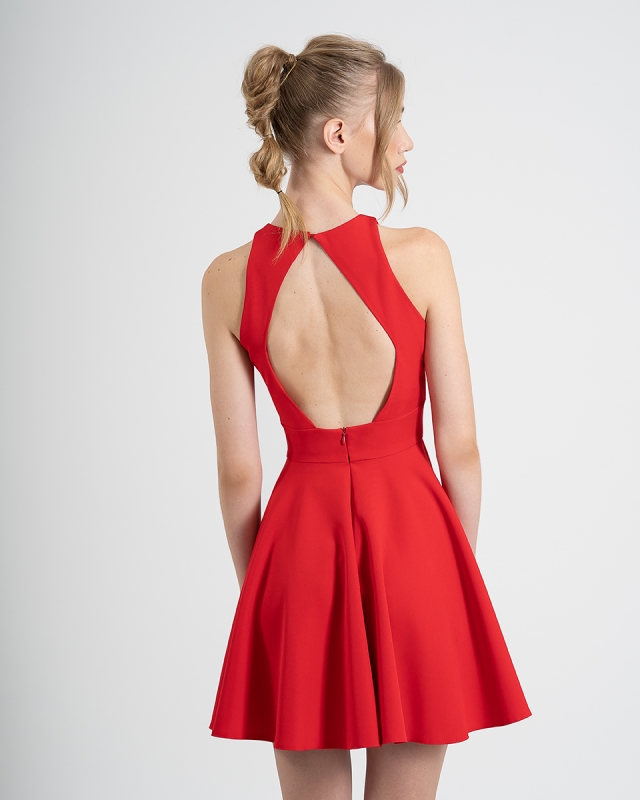 Sensacional vestido corto de fiesta confeccionado en crepé. Lleva un escote de cuello a la caja con una lágrima en el centro del pecho, una espalda descubiesta en el centro y una falda de capa. Un modelo sencillo y juvenil para aquellas que que tengan un evento de día. De la firma de MONCHO HEREDIA.