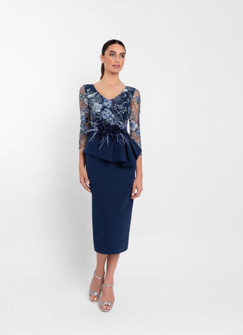 Asombroso vestido midi de fiesta confeccionado en crepé. Lleva un escote de cuello a la caja y mangas asimétricas, una lleva un original volante. Su falda entallada tiene un peplum en toda la cintura con un cinturoncito fino y una hebilla plateada. Un modelo sencillo y elegante para ir cómoda e ideal a cualquier fiesta. De la firma española de MONCHO HEREDIA.