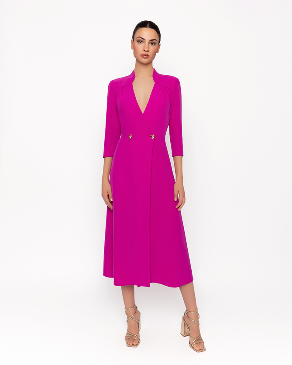 Sensacional vestido midi de fiesta confeccionado en crepé. Un cuello de pico con tirilla, unas mangas francesas y un cuerpo cruzado. Su falda es de vuelo con dos botones dorados en la cintura. Un modelo cruzado sencillo y estiloso con el que te sentirás muy cómoda como invitada en cualquier evento. De la firma Española MONCHO HEREDIA.