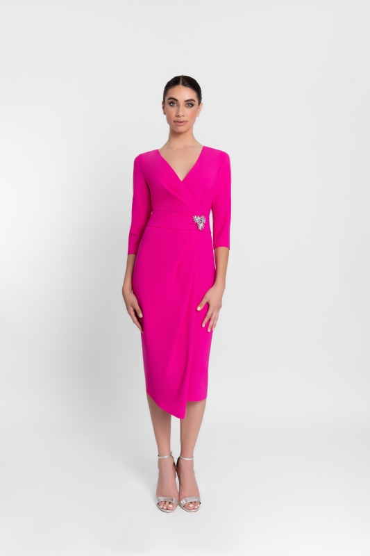 Sensacional vestido midi de fiesta, confeccionado en crepe. Lleva un escote cruzado, una espalda cerrada y bonito broche en la cintura. Su falda tiene el bajo asimétrico, ya que cruza hacia un lateral haciendop unos originales pliegues. Un modelo sencillo y actual muy apropiado para cualquier fiesta. De la firma de MONCHO HEREDIA.