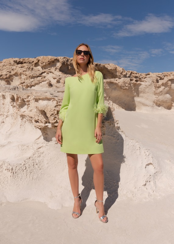 Espléndido vestido corto de fiesta confeccionado en crepé. Lleva un escote redondo, una espalda en forma de V y unas mangas francesas con unas originales plumas en su terminación con un lacito del mismo tejido. Su falda es de forma evasé. Un modelo sencillo y atractivo para ir ideal a tu fiesta. De la firma de MONCHO HEREDIA.