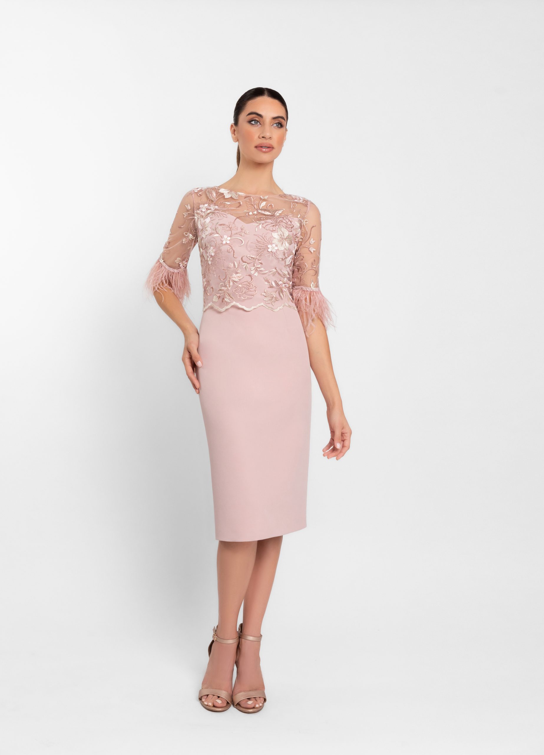 Sensacional vestido midi de fiesta confeccionado en crepé y tul bordado. Lleva un bonito cuerpo de tul bordado con el escote de cuello a la caja, unas mangas francesas con unas plumas en su terminación, y una falda de líneas rectas con una abertura detrás. Un modelo sencillo y elegante para destacar en cualquier fiesta. De la firma española de MONCHO HEREDIA.