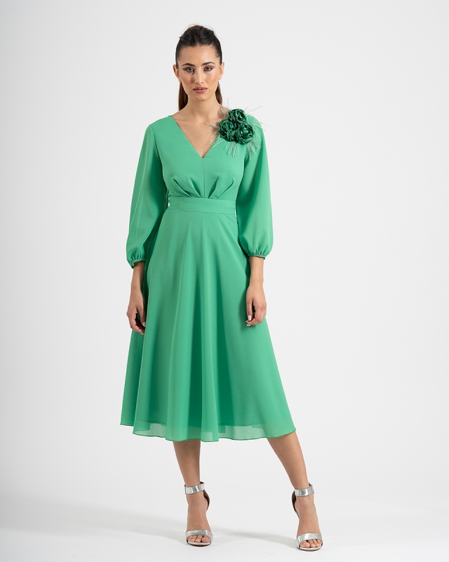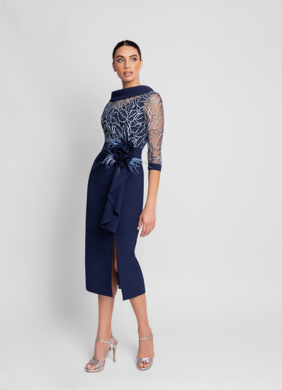 Espectacular vestido midi de madrina confeccionado en crepé y guipour. Lleva un escote barco envolvente y abierto, unas mangas francesas y una espalda en forma de V. Su falda en crepé es entallada con una abertura delantera. Como complemento tiene un cinturón en color liso con una flor adornado con plumas. Un modelo elegante y sofisticado que no pasará desapercibido en cualquier fiesta. De la firma española de MONCHO HEREDIA.