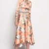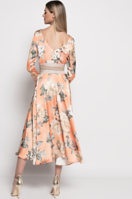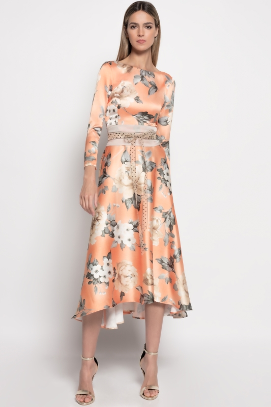 Bonito y sencillo vestido midi, de estampado floral y de piel de angeL; de cuello de barco y espalda de pico. Un modelo sencillo y vistoso para comuniones o bodas. De la firma de MATILDE CANO.