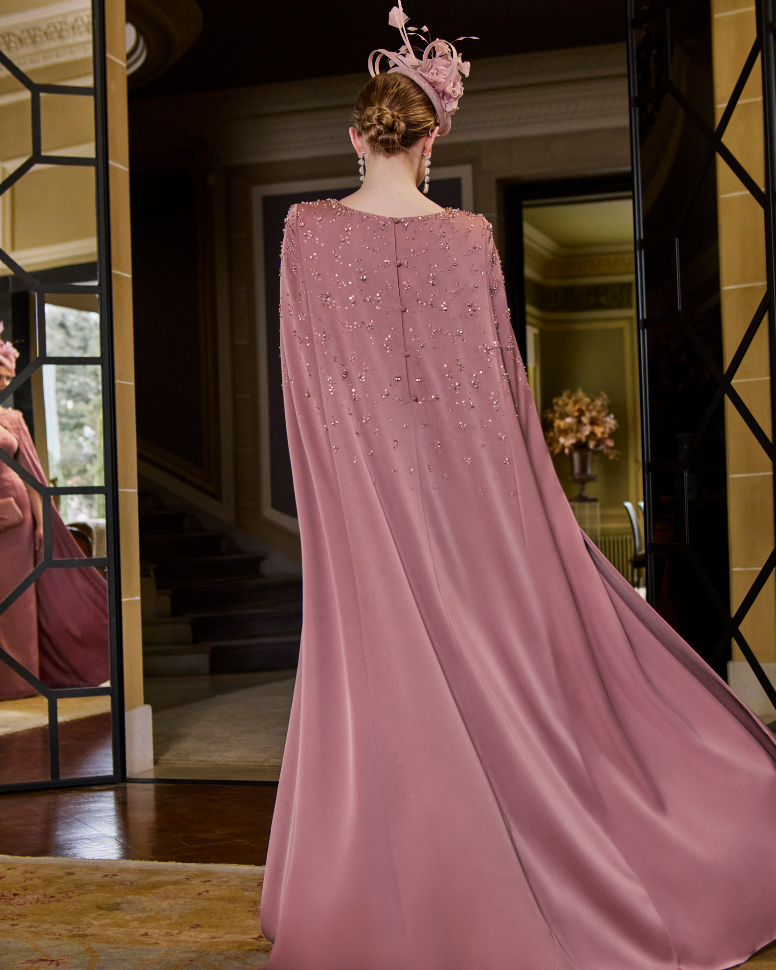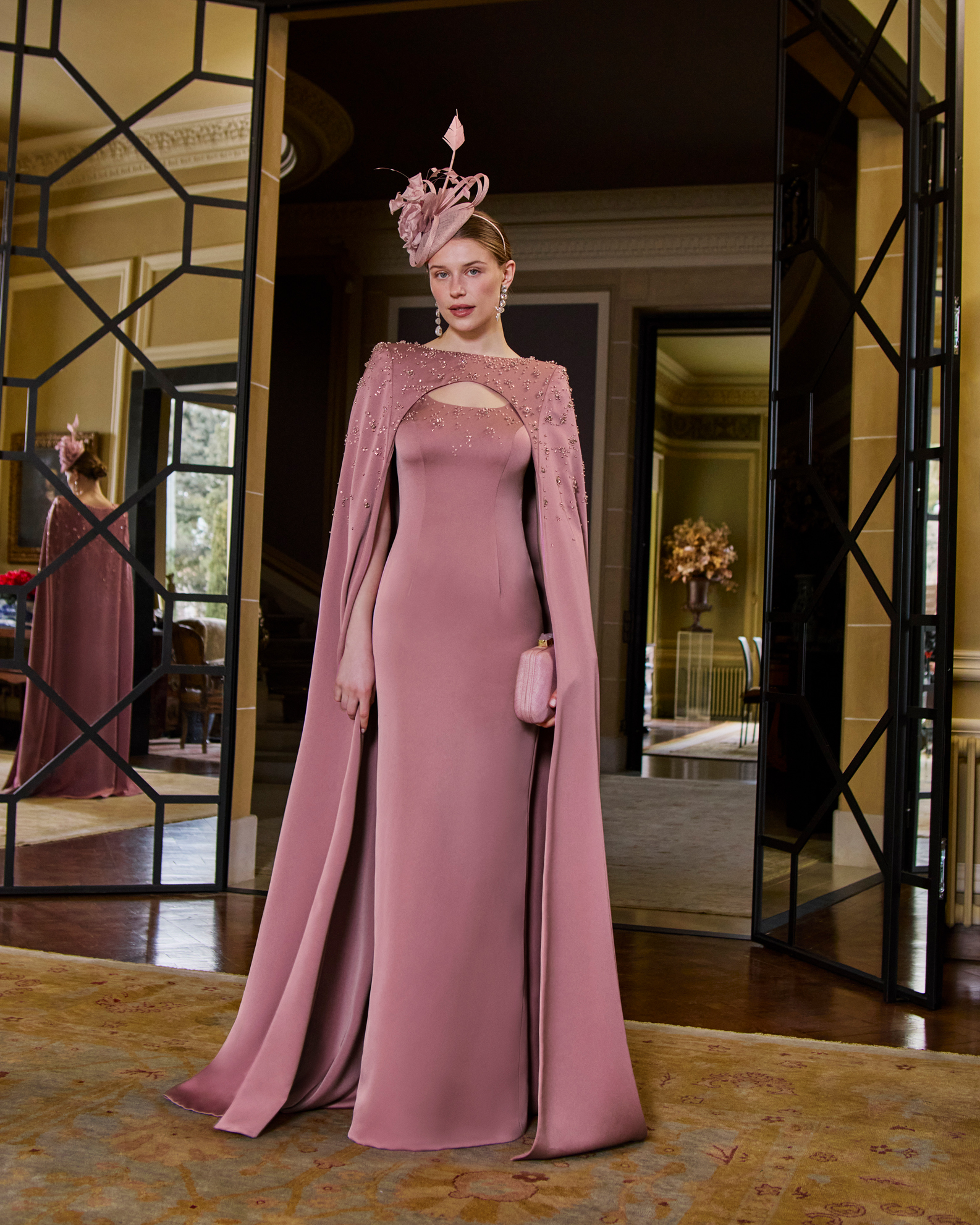 Espectacular vestido de madrina largo de fiesta en dos piezas confeccionadas en crepé satinado y pedrería. Lleva un escote redondo bajo con cuerpo de pedrería y su falda es entallada para definir la figura. Lo acompaña una capa abotonada detrás y con adornos de pedrería por ambas partes. Un modelo distinguido y elegante con el que brillarás en tu evento especial. De la firma Española ROSA CLARÁ BY COUTURE CLUB.