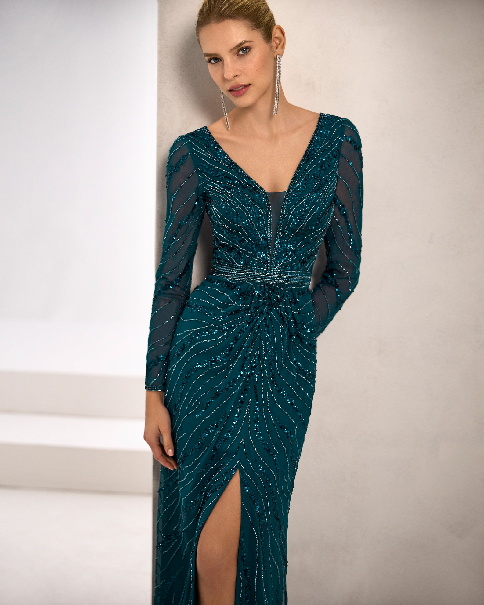 Deslumbrante vestido de fiesta confeccionado en pedrería. Lleva un escote en forma de V con un tul, una espalda en pico y unas mangas largas. Su falda entallada en forma de sirena con una poquita cola. Un modelo lleno de encanto y elegancia con el que brillarás en cualquier evento. De la firma Española ROSA CLARÁ BY MARFIL BARCELONA.