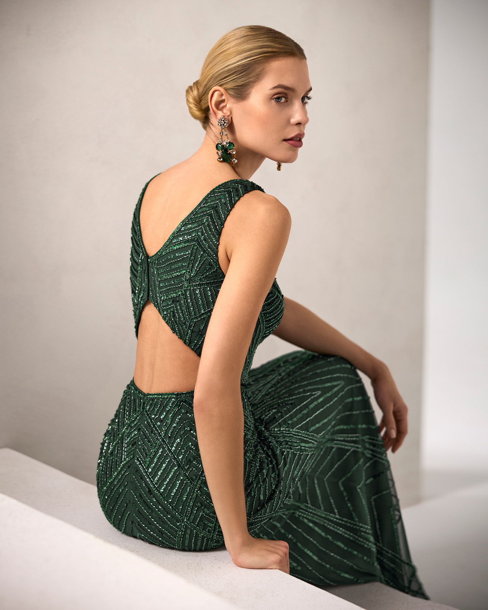 Deslumbrante vestido largo de fiesta confeccionado en pedrería. Lleva un escote en forma de V, una espalda en forma de pico con la espalda semidescubierta y unos tirantes anchos. Su falda entallada realza la figura y para terminar el look tiene una capa de gasa, atada al cuello con unos sencillos corchetes adornados con lentejuegas. De la firma Española ROSA CLARÁ BY MARFIL BARCELONA.