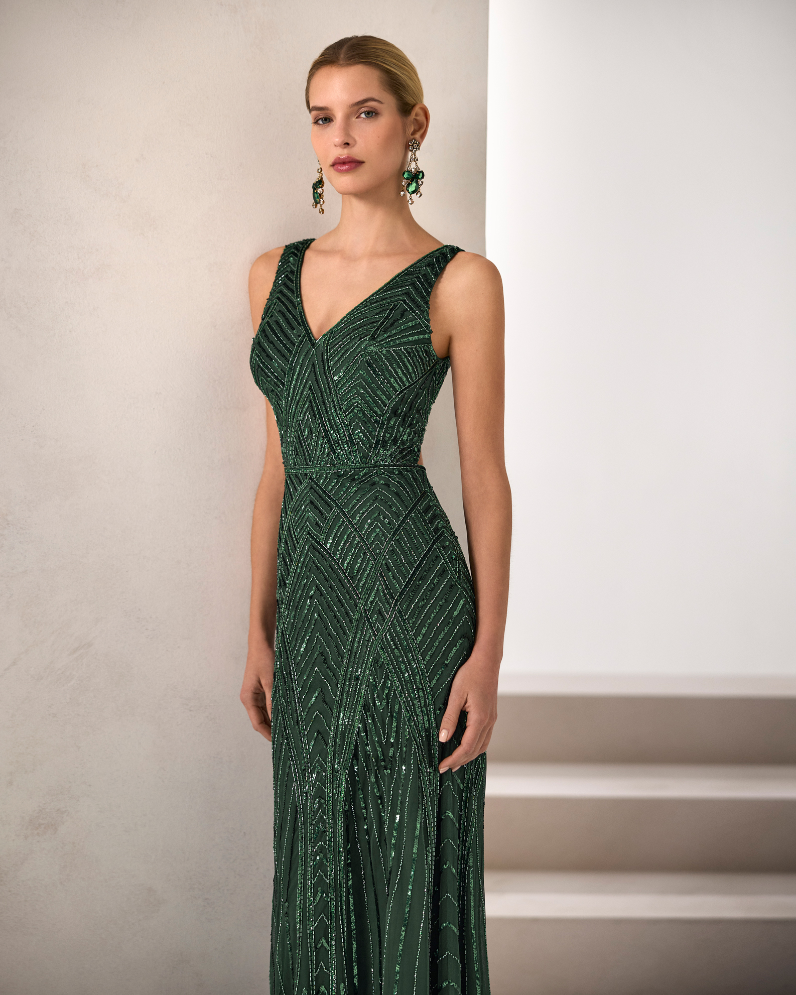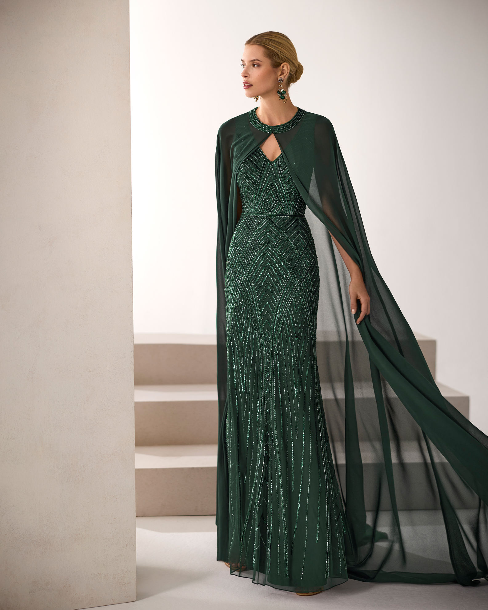 VESTIDO LARGO DE PEDRERÍA CON CAPA
