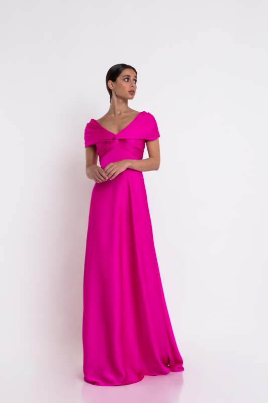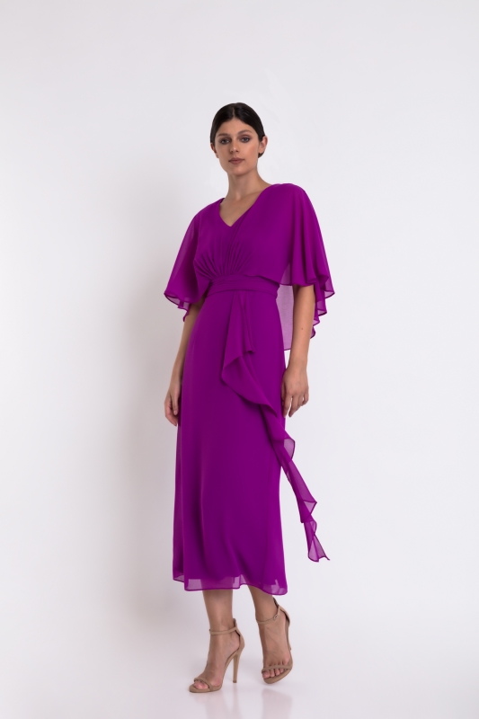 Sensacional vestido midi de fiesta confeccionado en gasa. Lleva un escote en V con una original capa que cae para detrás sobre los hombros, una falda recta y con un poco entallada en la cadera y suelta hacia el final. Un modelo fantástico y original para tu fiesta especial. De la firma de MATILDE CANO.