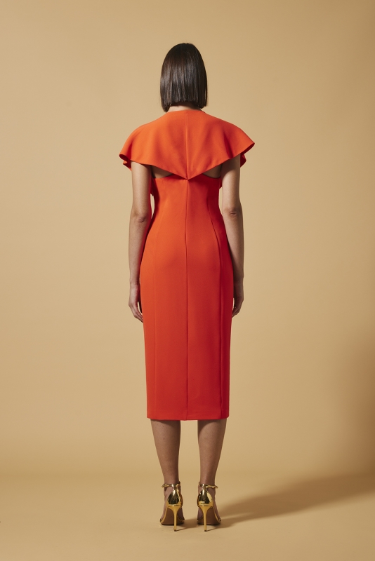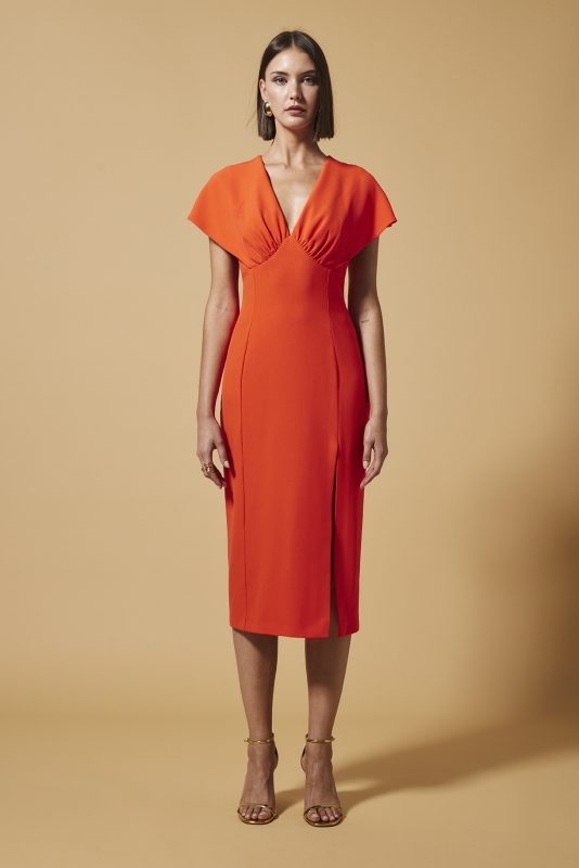 Estiloso vestido midi de fiesta confeccionado en crepé. Lleva unas bonitas mangas cortas estilo ranglán, con un escote en forma de V, un rizado muy original debajo del pecho y en la falda una abertura lateral. Un modelo muy estiloso y juvenil para ir guapa en cualquier fiesta. De la firma de J. ARGGIDO.
