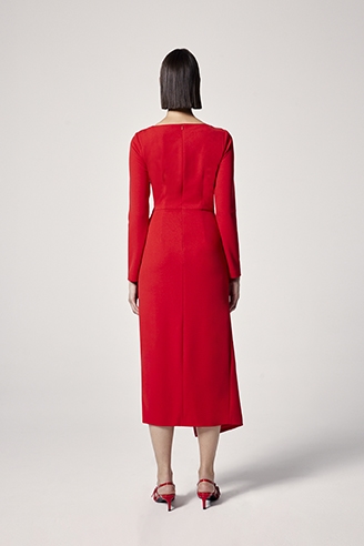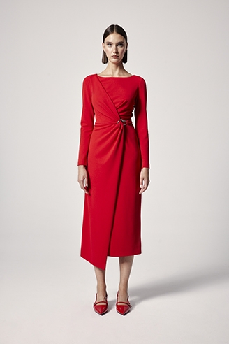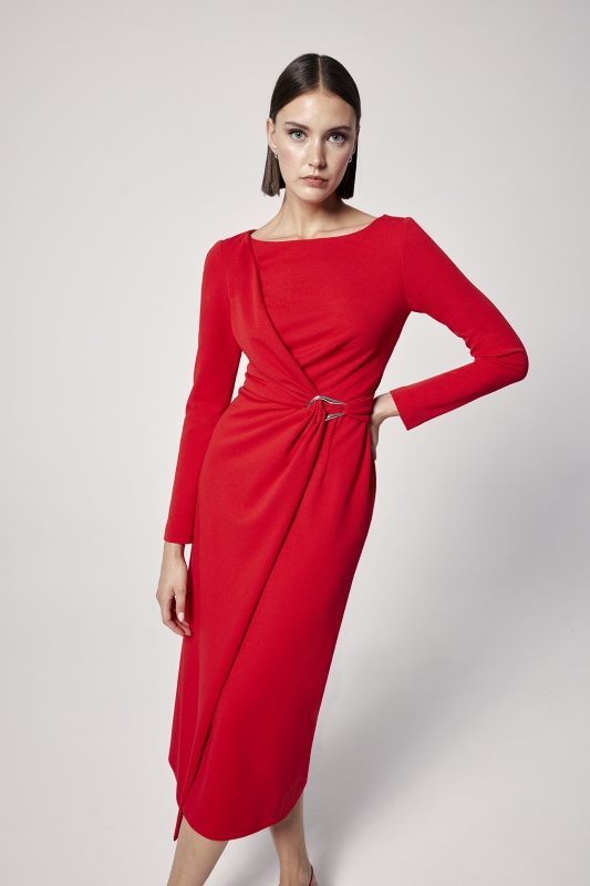 Sensacional vestido midi en color liso, confeccionado en crepé. Lleva un escote barco con una sobretela desde el hombro hasta el bajo sujeta con un nudo y una hebilla, con mangas largas y falda recta. Un modelo muy original y moderno con el que disfrutarás en cualquier fiesta. De la firma de J. ARGGIDO.