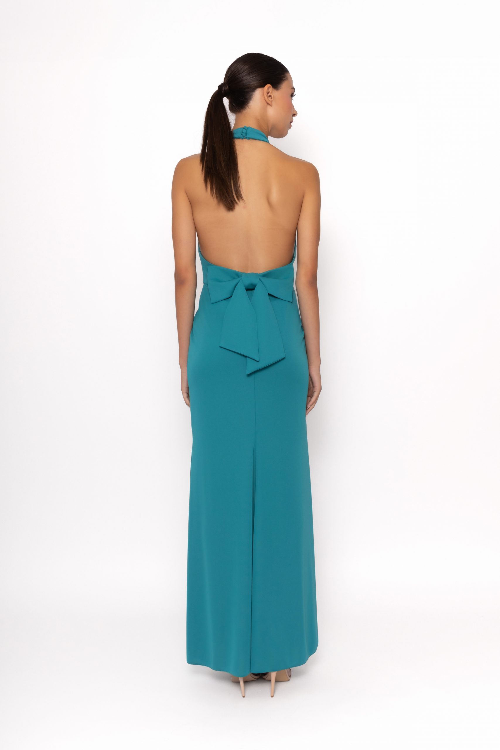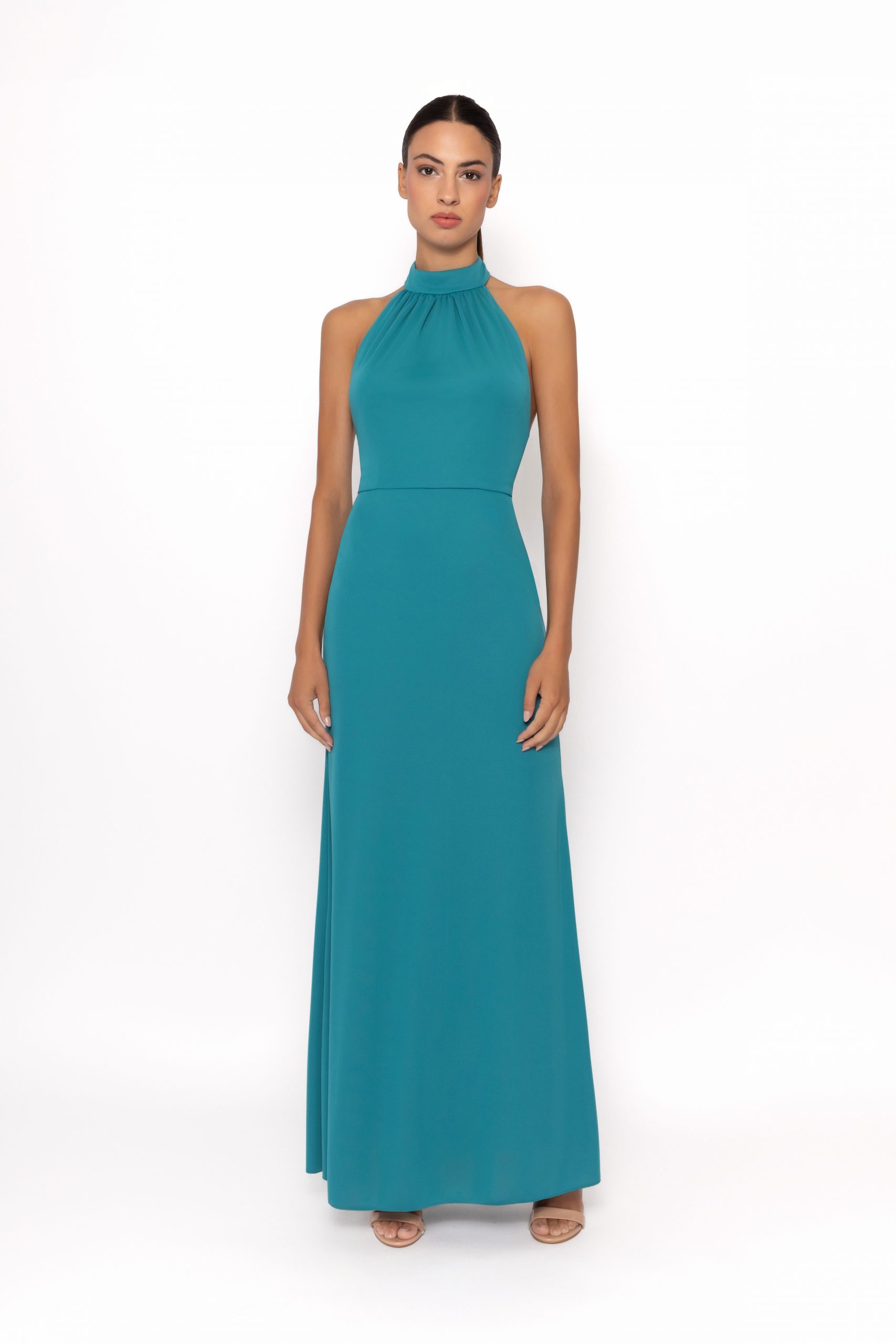 Asombroso vestido largo de fiesta confeccionado en gasa. Lleva un cuello halter sujeto con botones, una espalda abierta hasta la cintura y un lazo grante en la cintura. Su falda tiene un poco de forma desde la cintura hasta el bajo. Un modelo sencillo y juvenil con el que te sentirás cómoda y elegante en cualquier evento. De la firma Española J.ARGGIDO.