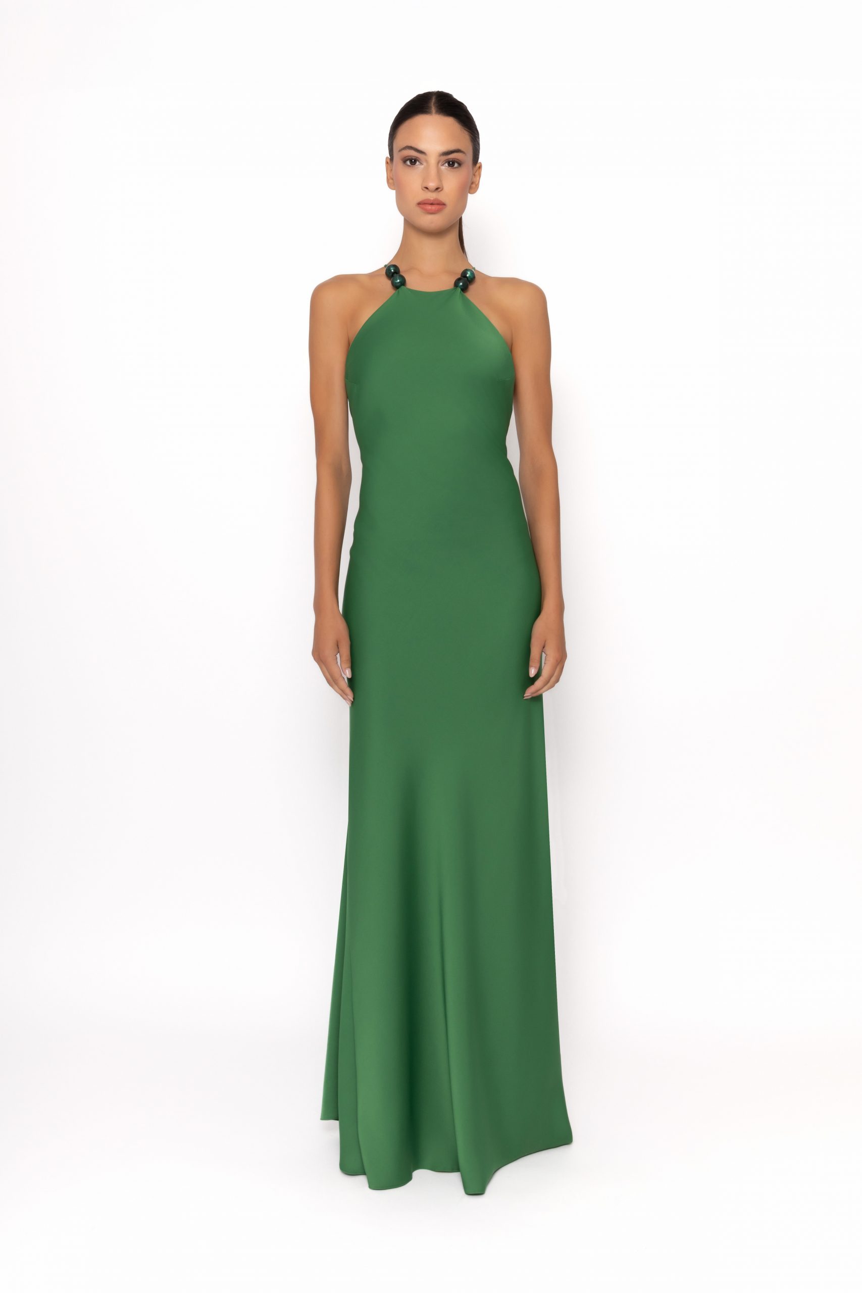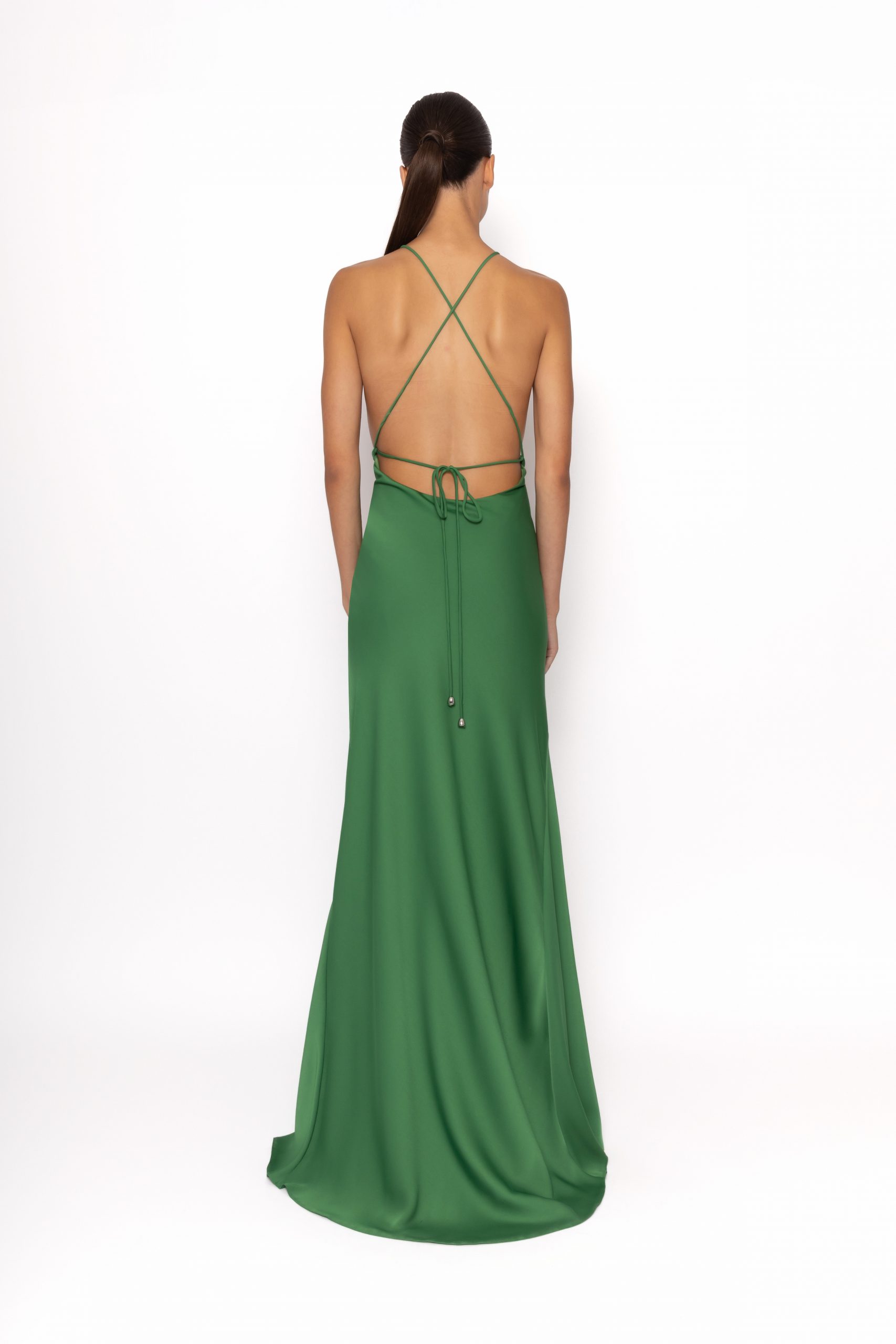 Sensacional vestido largo de fiesta confeccionado en gasa satinada. Lleva un bonito cuello halter, una espalda descubierta con tiras cruzadas. Su falda entallada tiene su corte al bies para realzar su figura. Un modelo juvenil y sencillo con el que disfrutar en cualquier evento. De la firma Española ARGGIDO.