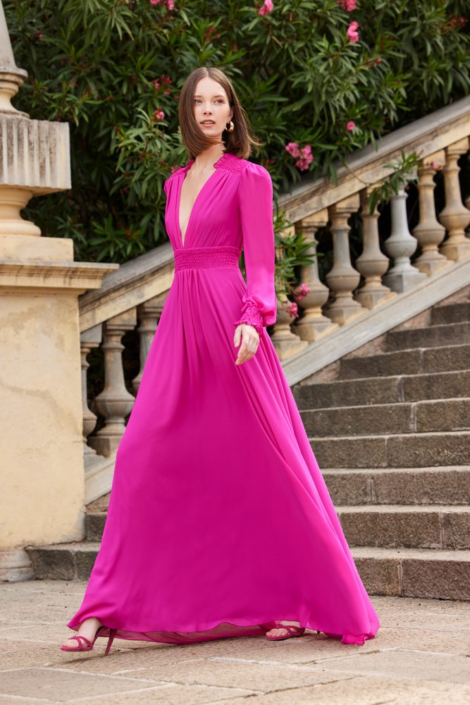 Bonito vestido largo en color liso, confeccionado en crepe. Lleva una aplicación de swarovski en un lateral de la cintura y unas jaretas, en el otro. Un elegantísimo modelo, lleno de encanto y sencillez. De la firma de CARLA RUIZ.