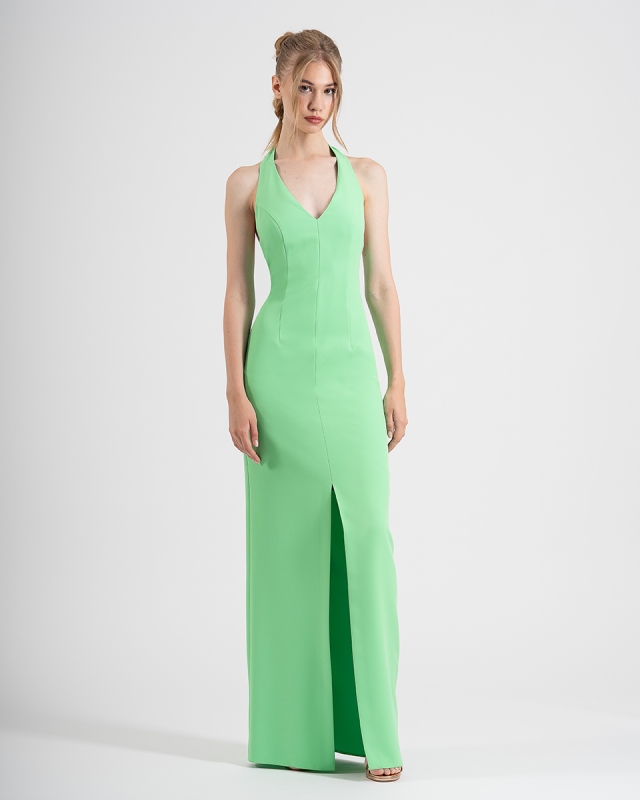 Destacado vestido largo de fiesta confeccionado en crepé. Lleva un escote atado al cuello con escote en V, una original espalda descubierta y la falda entallada tiene una abertura lateral. Un modelo sencillo y juvenil para aquellas que quieran resaltar en su fiesta. De la firma de MONCHO HEREDIA.