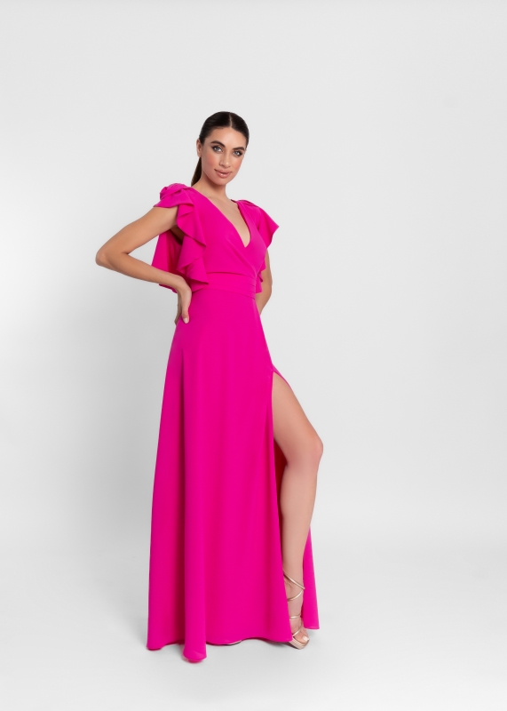 Sensacional vestido largo de fiesta confeccionado en crepé. Lleva un escote cruzado en forma de V, unos volantes muy originales en el hombro y un cinturón ancho de jaretas. Su falda es de vuelo con una abertura lateral muy sexy. Un modelo lleno de luz, sensualidad y muy juvenil para destacar en cualquier evento. De la firma española de MONCHO HEREDIA.