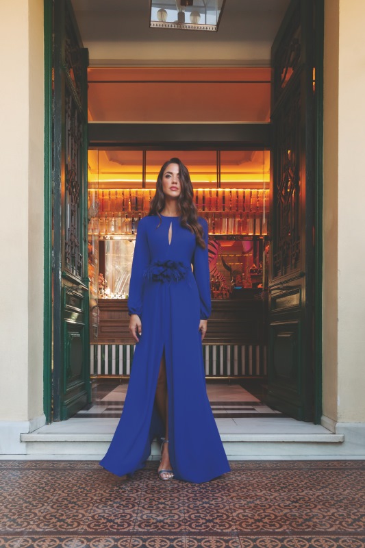 Excelente vestido largo de fiesta confeccionado todo de gasa. Lleva un escote de cuello a la caja con una lágrima en el pecho abierta, unas originales mangas largas abiertas y encgomadas en la muñeca, un cinturón sencillo del mismo tejido y una falda de capa con una abertura central. Un modelo que brilla por su sencillez y elegancia. De la firma de MONCHO HEREDIA.