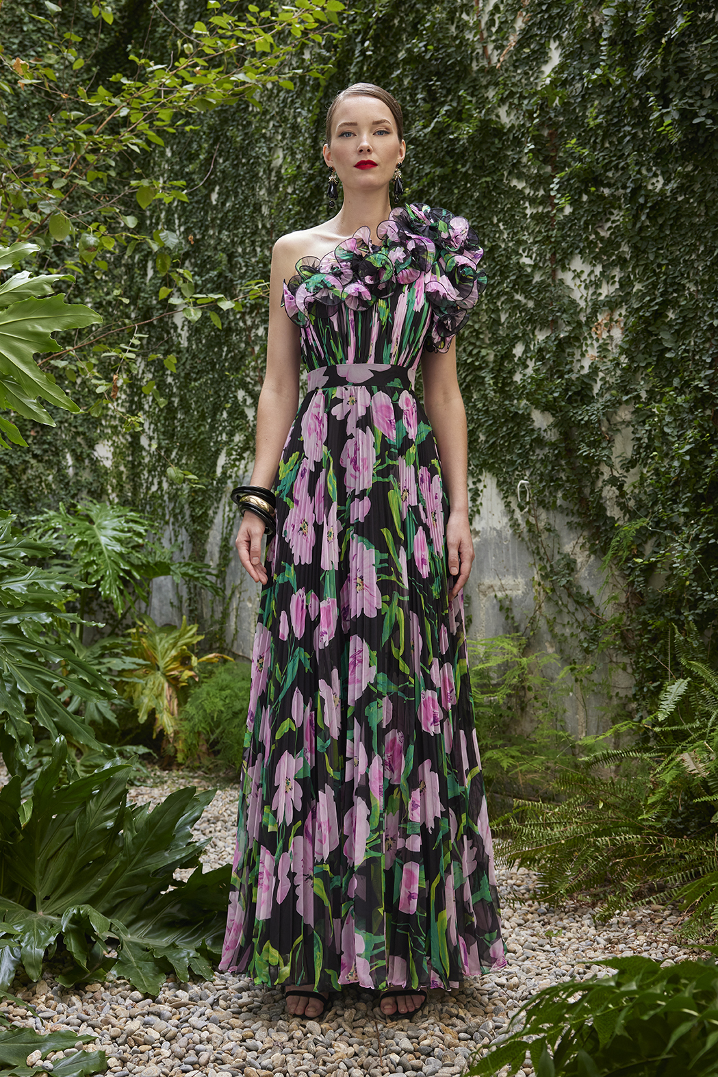 Asombroso vestido largo estampado de fiesta, confeccionado en gasa. Lleva un escote asimétrico, con un tirante sí y otro no, desde donde salen unos volantitos super originales, un cinturón ancho y la falda con vuelo; todo ello en plisado soleil. Un modelo muy estiloso y atractivo con el que brillarás. De la firma de CARLA RUIZ.