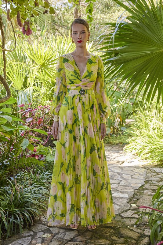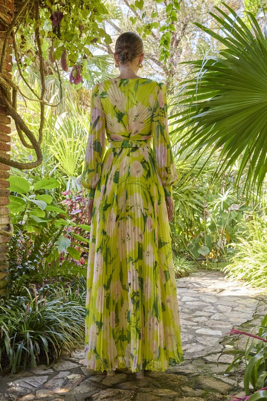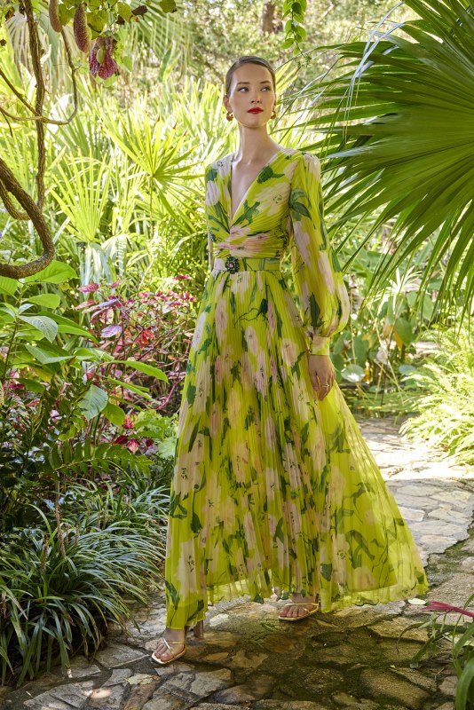 Asombroso vestido largo estampado de fiesta, confeccionado en gasa. Lleva un escote en forma de V muy pronunciado, unas mangas largas vaporosas con un puño al final, la falda es de vuelo y tiene un cinturón con un broche. Un modelo sencillo y elegante con el que disfrutarás en tu fiesta. De la firma de Carla Ruiz.