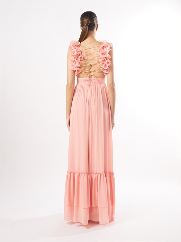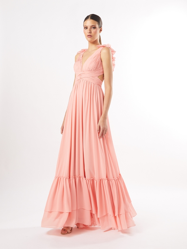 Espectacular vestido largo de fiesta confeccionado en gasa. Lleva un bonito cuerpo plisado, un escote en V, unos tirantes de volantitos con una espalda descubierta con tiras cruzadas y una falda de vuelo con un volante ancho en el final. Un modelo sexy y juvenil para todo tipo de eventos como graduaciones, bodas, etc…. De la firma de CARLA RUIZ.