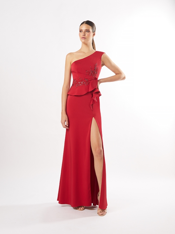 Deslumbrante vestido largo de fiesta confeccionado en crepé. Lleva un escote asimétrico con un tirante ancho, la cintura lo acompaña una tela ancha con unas piedrecitas con unos volantes; su falda es entallada con una abertura lateral muy sexy. Un modelo elegante y juvenil con el que no te podrás resistir. De la firma de CARLA RUIZ.