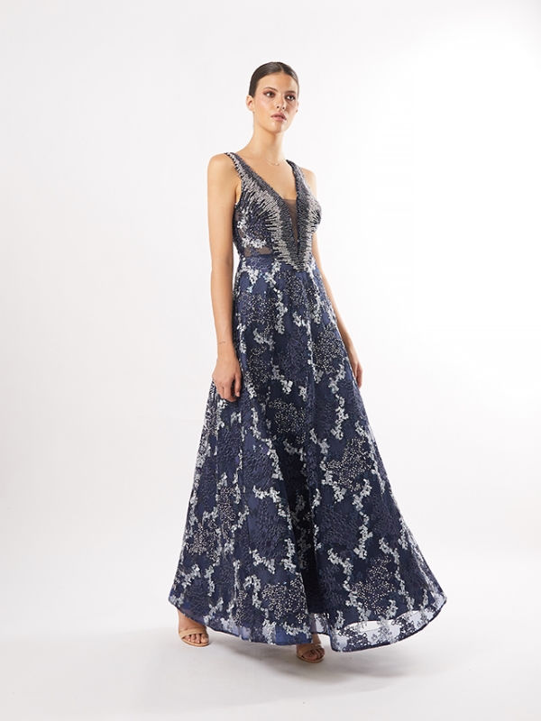 Espectacular vestido largo de fiesta confeccionado de encaje bordado. Lleva un escote y una espalda en forma de V, unos tirantes anchos y una falda de vuelo. Un modelo lleno de belleza y encanto que te encantará nada más ponertelo. De la firma de CARLA RUIZ.