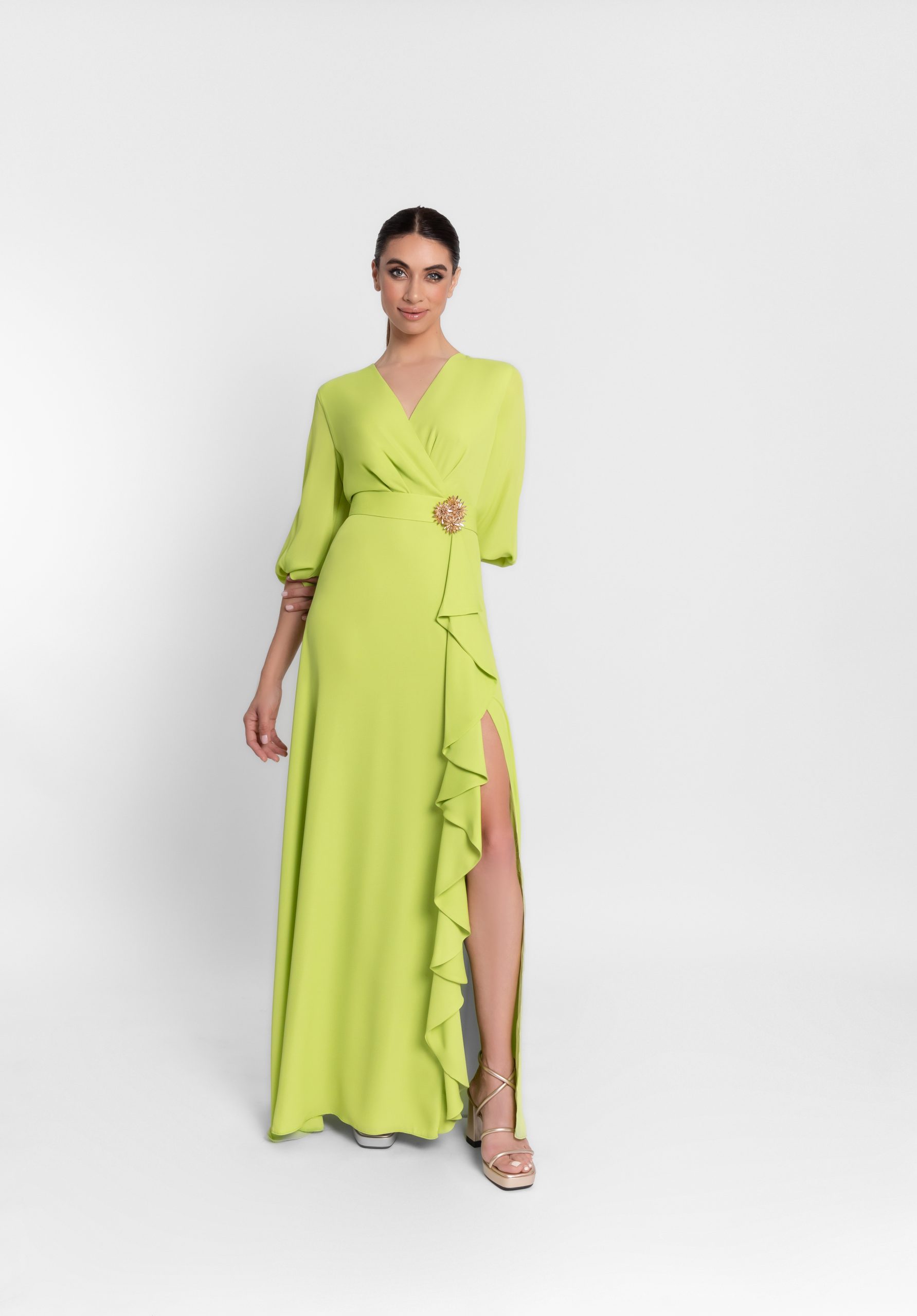 Asombroso vestido largo de fiesta confeccionado en crepé. Lleva un escote cruzado, una espalda cerrada y unas mangas francesas engomadas. Su falda es de vuelo con una abertura lateral con una cascada de volantes y un cinturón con una hebilla dorada. Un modelo sencillo y original para cualquier evento de fiesta que tengas. De la firma española de MONCHO HEREDIA.