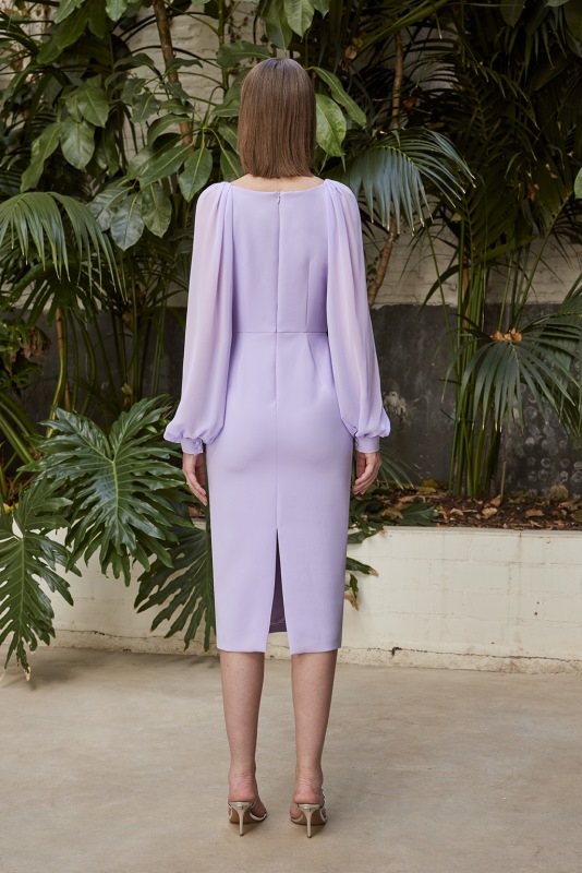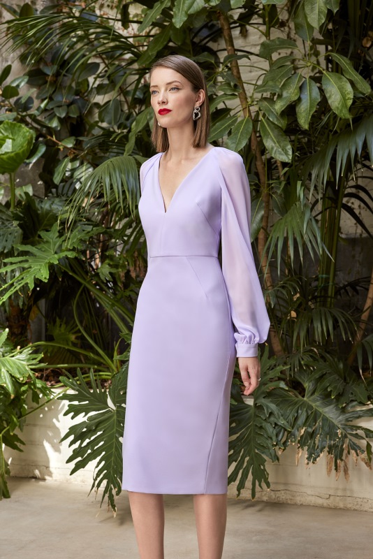 Sensacional vestido midi de fiesta confeccionado en crepé y gasa. Lleva unas mangas de corte ranglan de gasa, un escote en V un poco pronunciado y la falda de líneas rectas. Un modelo sencillo y elegante para cualquier evento que tengas. De la firma de CARLA RUIZ.