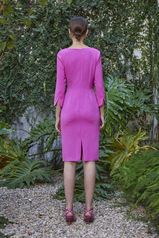 Fantástico vestido corto de fiesta confeccionado en crepé. Lleva un escote redondo, unas mangas francesas abiertas al final, unos originales pliegues en el cuerpo adornado con flores de tela; la falda es de líneas rectas con abertura trasera. Un modelo sencillo y clásico para cualquier evento. De la firma de CARLA RUIZ.