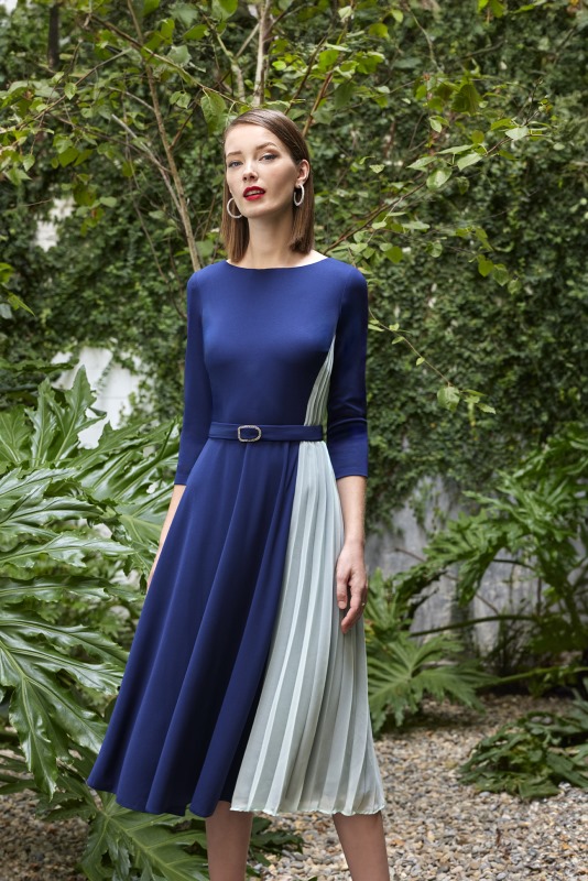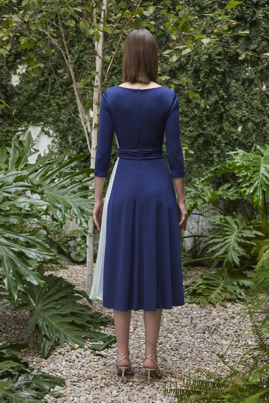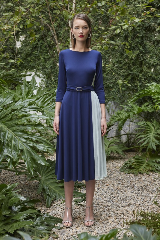 Deslumbrante vestido midi de fiesta confeccionado en punto de alta calidad. Lleva unas mangas francesas, un escote con cuello barco, una original falda de vuelo con una parte en la cadera en plisado soleil. Un modelo moderno y distinguido para la persona que quiera destacar en cualquier fiesta. De la firma de CARLA RUIZ.