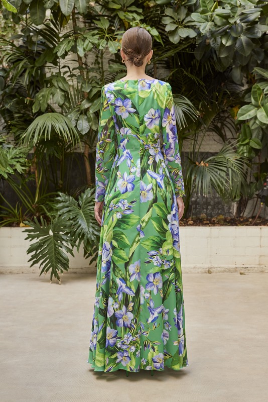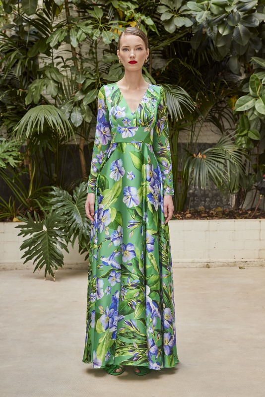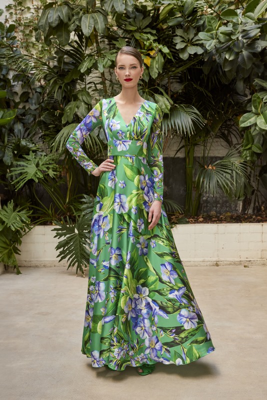 Excelente vestido largo estampado de fiesta, confeccionado en gasa y en piel de ángel. Lleva un bonito escote en V, mangas largas de gasa y falda de vuelo. Un modelo desenfadado y sencillo para destacar en cualquier fiesta. De la firma de CARLA RUIZ.