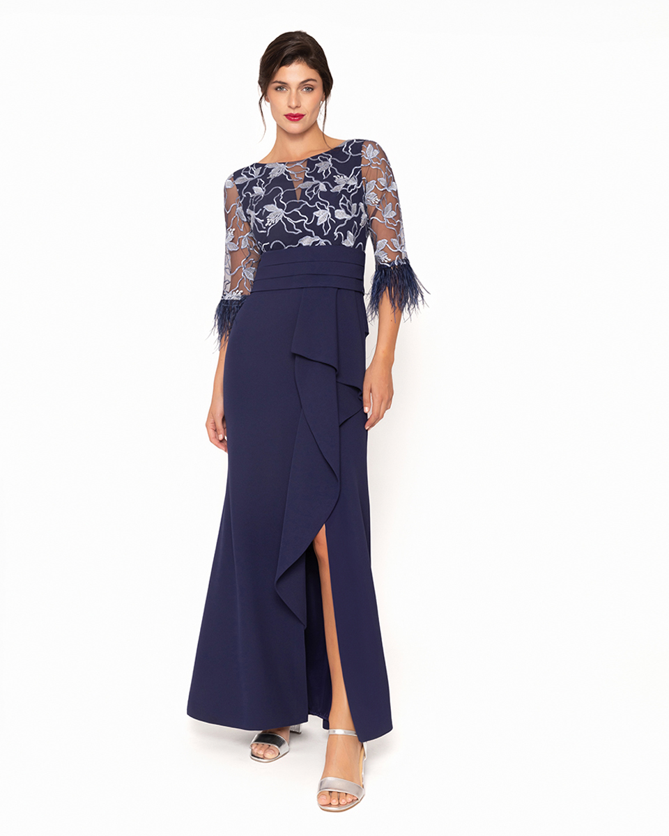 Espectacular vestido de madrina largo confeccionado en crepé y tul bordado. Lleva un escote de cuello de barco y una espalda cerrada con unas mangas francesas con ondas en su terminación y todo es cuerpo es de tul bordado. Su falda es entallada toda de crepé con una abertura en un lateral adornada con un gracioso volante y en la cintura un original peplum. Un modelo lleno de estilo y sofisticación para destacar en tu fiesta. De la firma española de MONCHO HEREDIA.