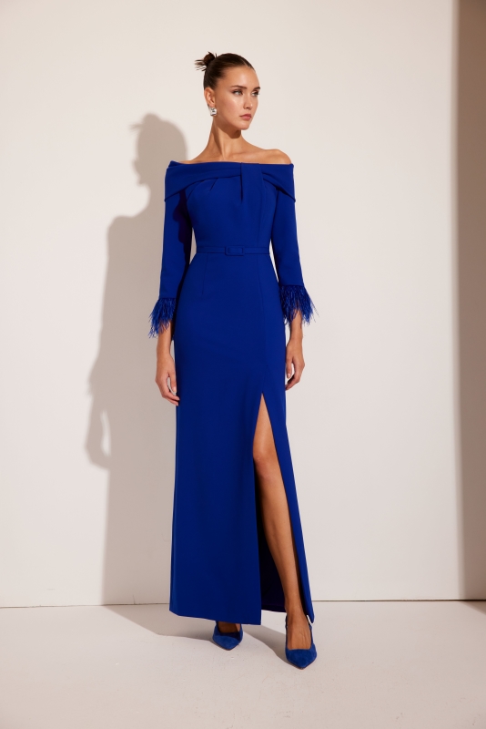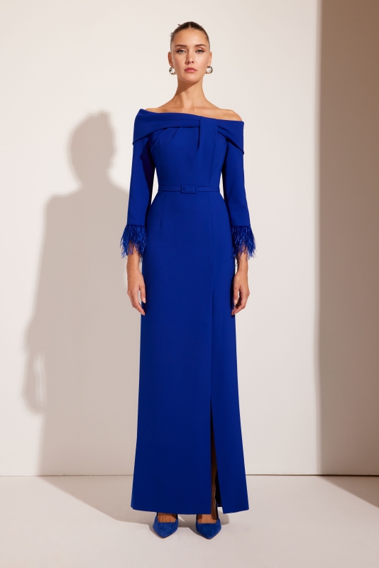 Espectacular vestido de madrina largo confeccionado en crepé. Lleva un escote y una espalda de cuello de barco con vuelta, unos pliegues muy originales en el cuerpo y unas mangas francesa con plumas en su terminación. Una falda entallada con una abertura lateral y con un pequeño cinturón de tela en la cintura. Un modelo sencillo y elegante para destacar en cualquier fiesta que tengas. De la firma espeñola de CARLA RUIZ.