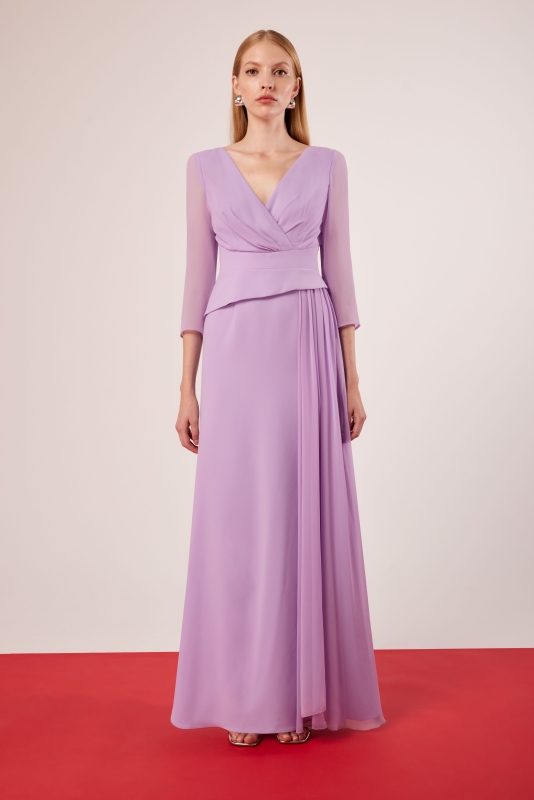 Asombroso vestido de madrina largo confeccionado en gasa. Lleva un escote de pico con pliegues, una esplada cerrada y unas mangas francesas transparentes. Su falda en forma de A, tiene un original pleplum asimétrico con una gasa adiccional en un lateral. Un modelo sencillo y muy elegante para con el que destacarás en tu fiesta. De la firma española de CARLA RUIZ.