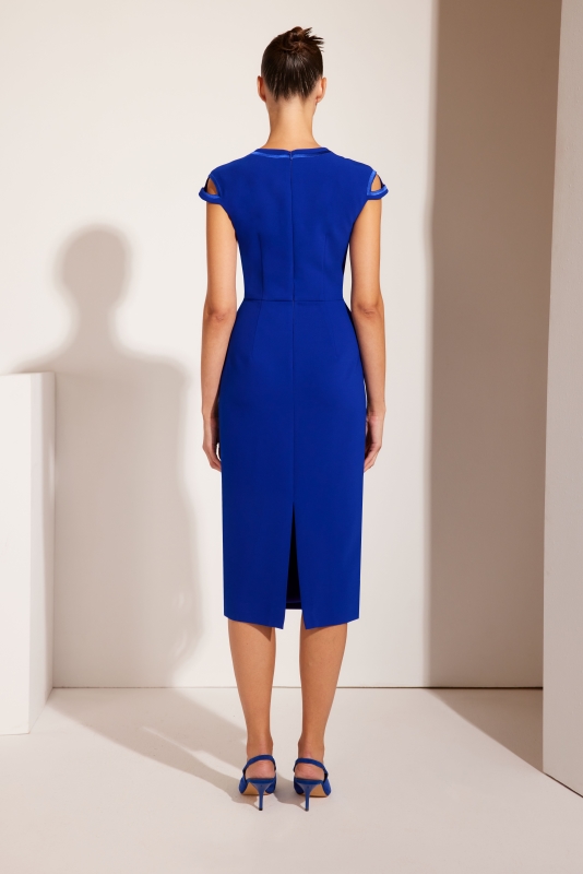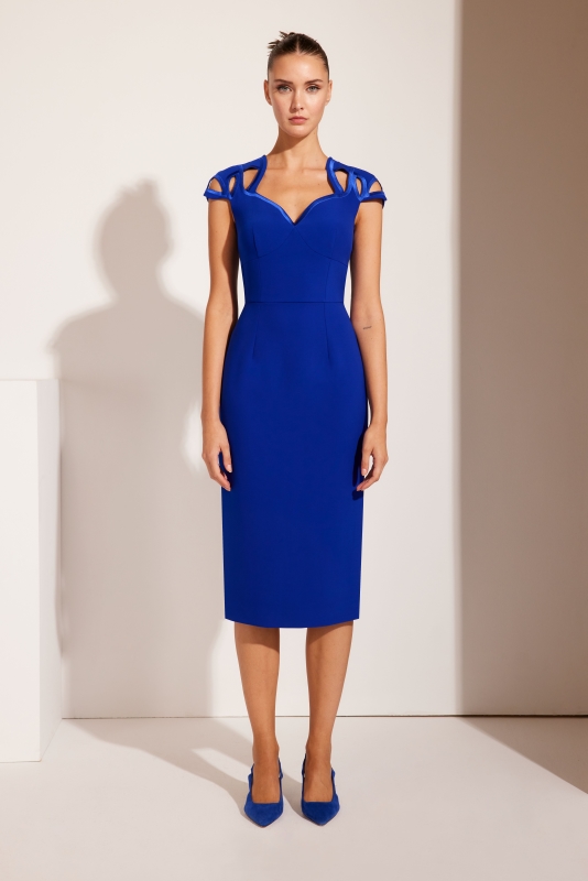 Excelente vestido midi de fiesta confeccionado en crepé. Lleva un bonito escote de corazón y unos originales troquelados de tela en el hombro marcados con un bies de raso. Su falda es entallada con una abertura trasera. Un modelo sencillo, juvenil y estiloso que te harán marcar tu figura en cualquier evento que tengas. De la firma de CARLA RUIZ.