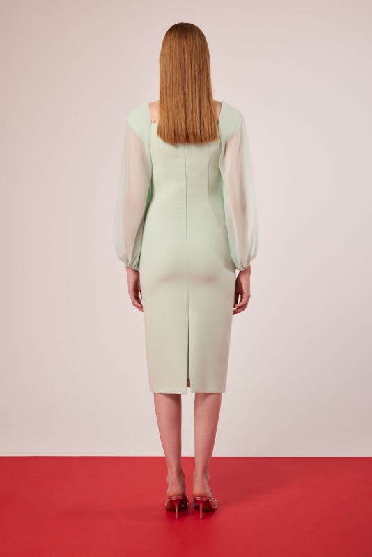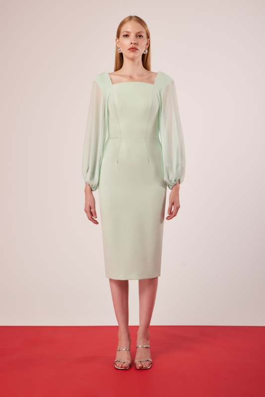 Sensacional vestido corto de fiesta confeccionado en crepé y gasa. Lleva un escote y una espalda cuadrada y unas mangas largas de gasa. Su falda es de líneas rectas. Un modelo sencillo y original por su combinación de tejidos; apto para cualquier evento que tengas. De la firma Española de CARLA RUIZ.