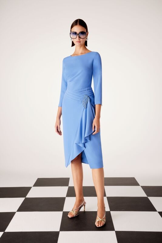 Deslumbrante vestido corto de fiesta confeccionado en crepé. Lleva un escote de cuello a la caja, un cuerpo con algunos pliegues en un lateral, la espalda cerrada y mangas francesas. Su original falda asimétrica tiene unas jaretas en la cintura y un bonito volante en la abertura central. Un modelo lleno de encanto y originalidad para Aquellas personas que quieran destacar en su evento especial. De la firma CARLA RUIZ.
