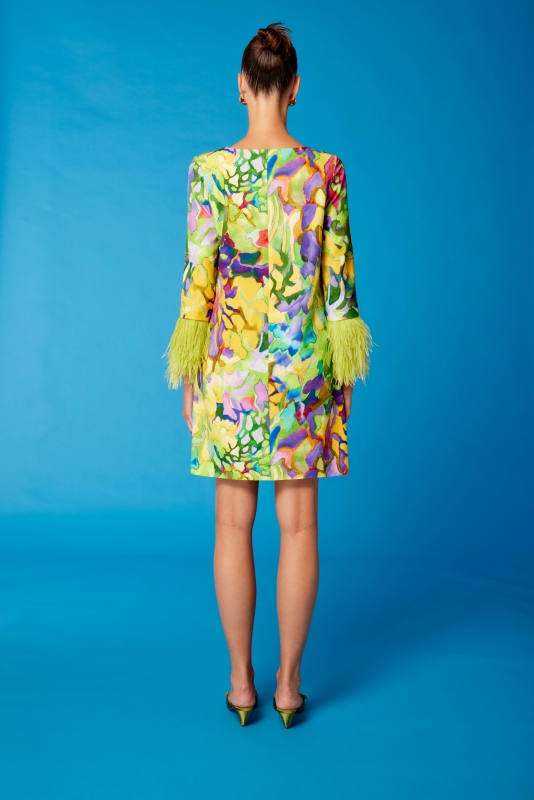 Sensacional vestido corto de fiesta confeccionado en crepé. Lleva un escote de cuello de barco, una espalda cerrada, unas mangas francesas con plumas en su terminación y de falda de evasé. Un modelo muy sencillo y estiloso para aquellas personas que quieran ir modernas a cualquier evento. De la firma de CARLA RUIZ.