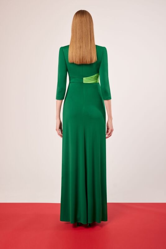 Espectacular vestido de madrina largo confeccionado en icra de alta calidad y gasa. Lleva un escote de cuello a la caja y espalda cerrada, mangas pegadas y francesas. Su cuerpo tiene en la cintura tejido de gasa que cae hacia el otro lado y hacia el bajo, sujeto con un broche y de plisado soleil. Su falda es entallada sólo en cintura y caderas, luego hace forma de A. Un modelo lleno de encanto, elegancia y sofisticación para destacar en cualquier fiesta.De la firma española de CARLA RUIZ.