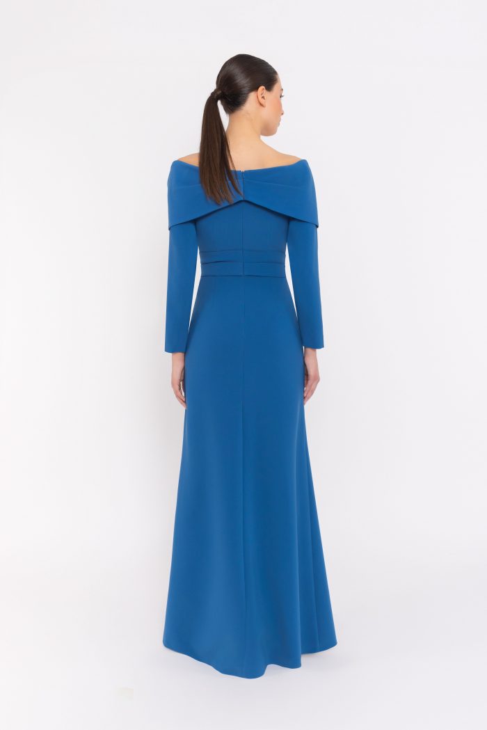 Espectacular vestido de madrina largo confeccionado en crepe. Lleva un bonito escote de barco con un pico transparente de tul, unas mangas largas y una falda recta con forma de A y con una abertura lateral. Tiene un cinturón de jaretas con una tira que cuelga hacia el bajo, tapando la abertura. Un modelo muy elegante y distinguido para aquella madrina que quiera destacar en cualquier fiesta. De la firma Español ad CARLA RUIZ.