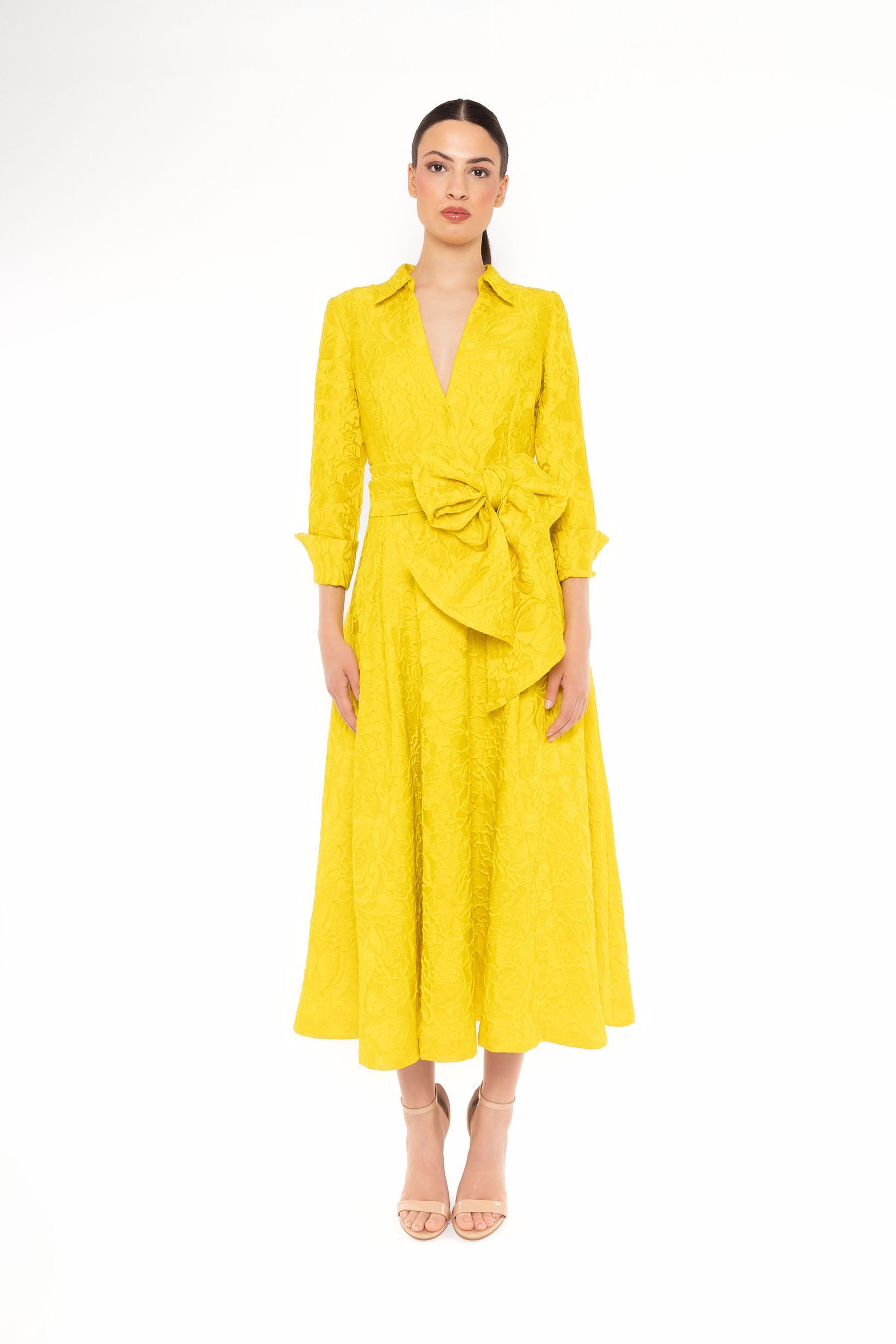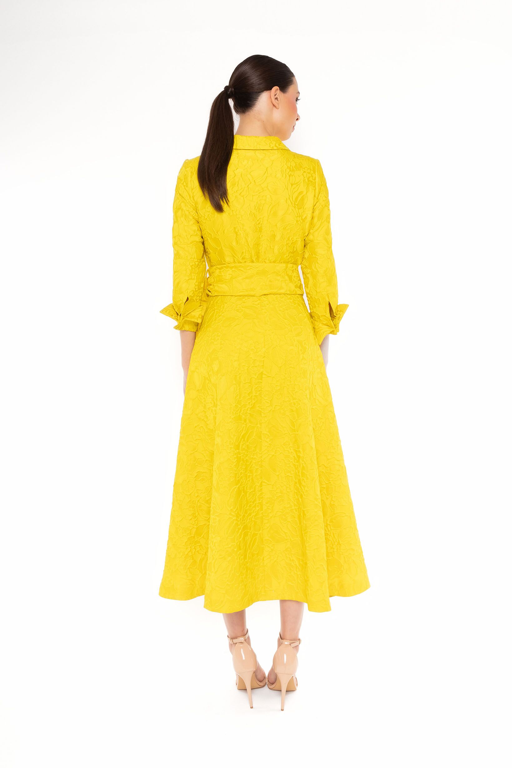 Sensacional vestido midi de fiesta confeccionado en cloqué. Lleva un escote de pico, una espalda cerrada con cuello de camisa y mangas largas con vuelta al final. Su falda es de vuelo y tiene un cinturón ancho para lazada. Un modelo sencillo y estiloso, donde la elegancia va acompañada con ese tejido de fiesta ideal para ir a cualquier evento. De la firma Española CARLA RUIZ.