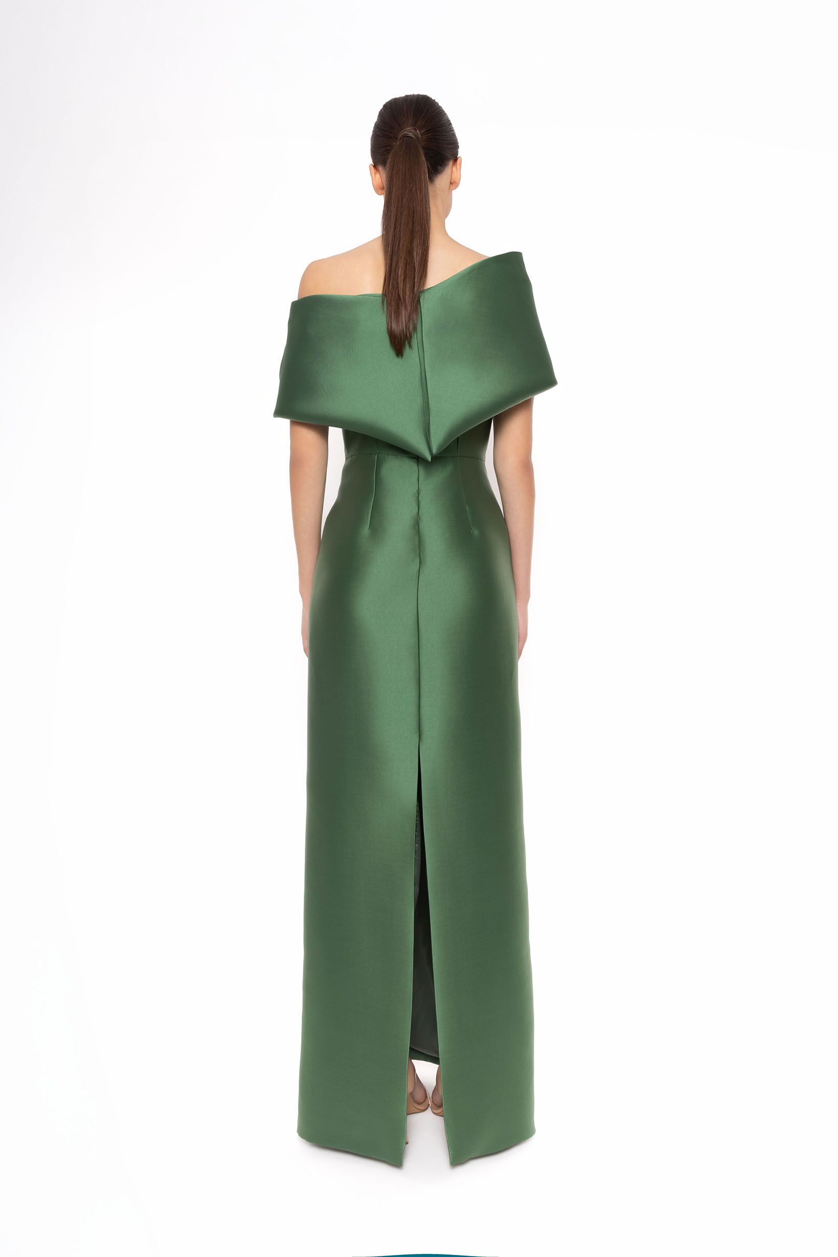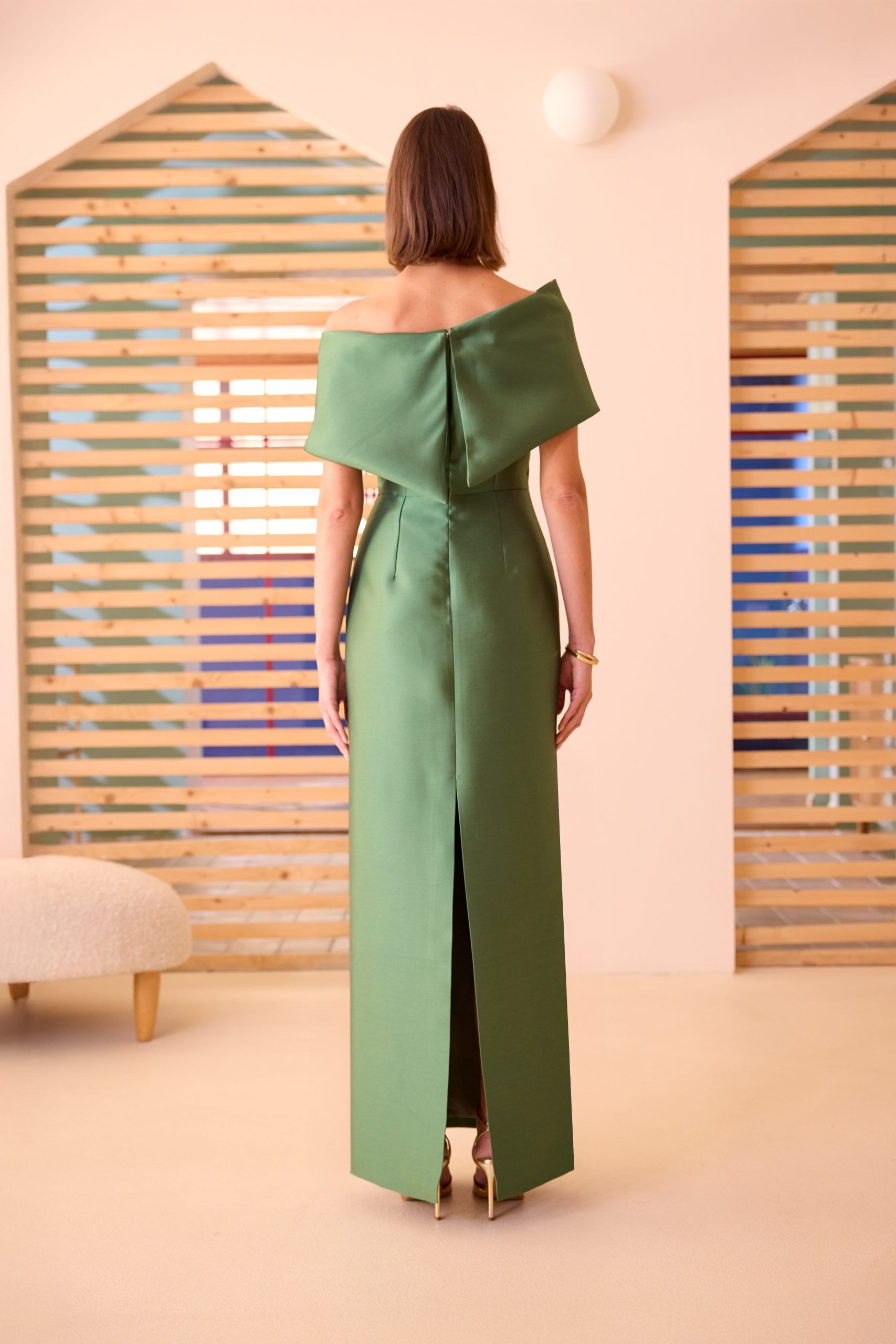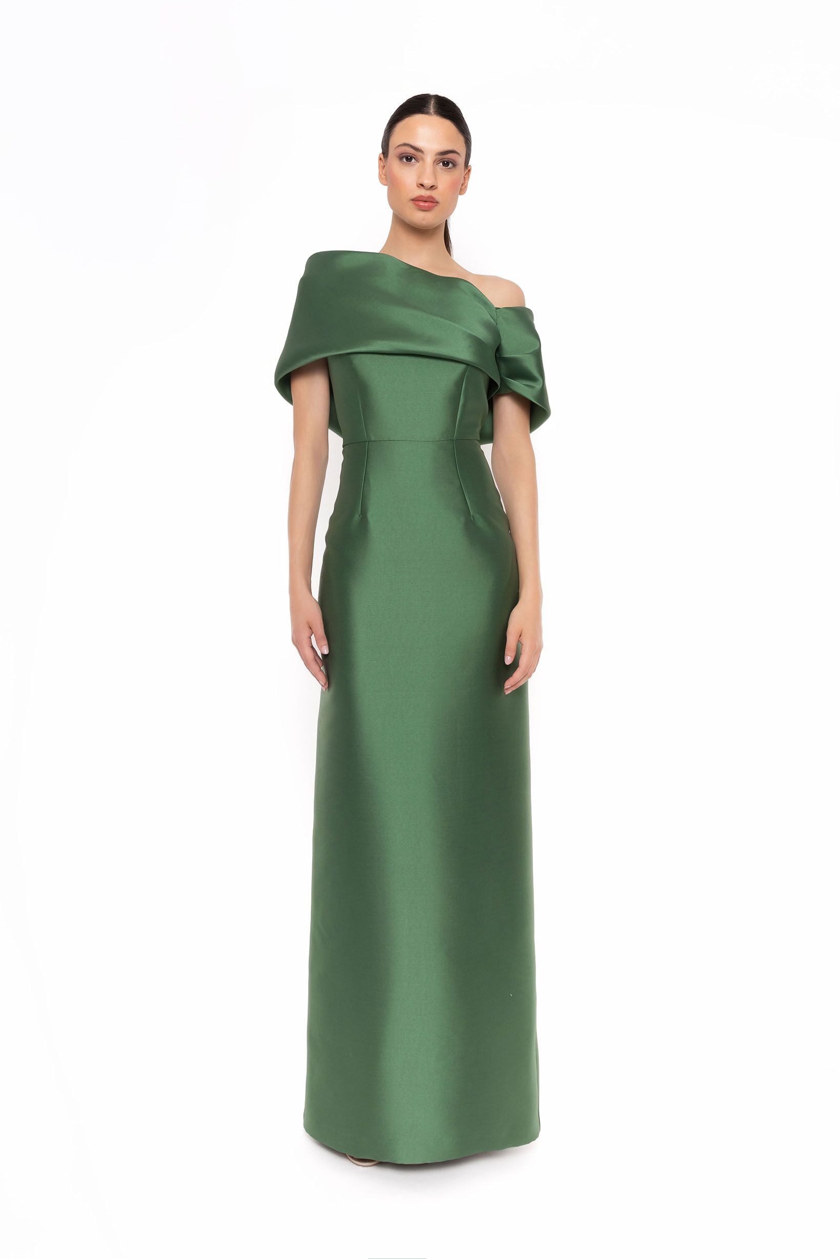 Sensacional vestido de madrina largo de fiesta confeccionado en mikado. Lleva un bonito y original cuello de barco, tipo bardot asimétrico y su falda es recta con una abertura trasera. Un modelo lleno de encanto y elegancia para destacar en cualquier fiesta. De la firma Española CARLA RUIZ.