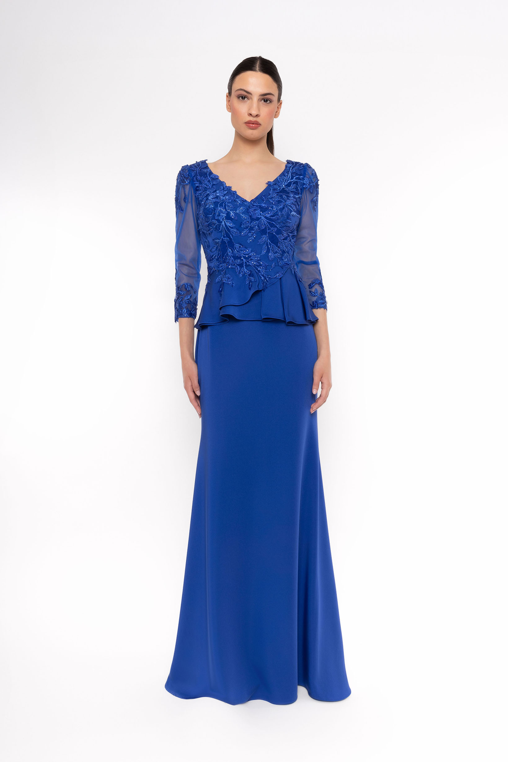Espectacular vestido de madrina largo de fiesta confeccionado en crepé y tul bordado. Lleva un escote de pico, una espalda en forma de V y un cuepo y unas mangas largas de tul bordado. Su falda es entallada de la cadera y recta hacia el bajo y con un bonito peplum en la cintura. Un modelo digno de una madrina elegante y distinguida que quiera destacar en cualquier fiesta. De la firma Española CARLA RUIZ.