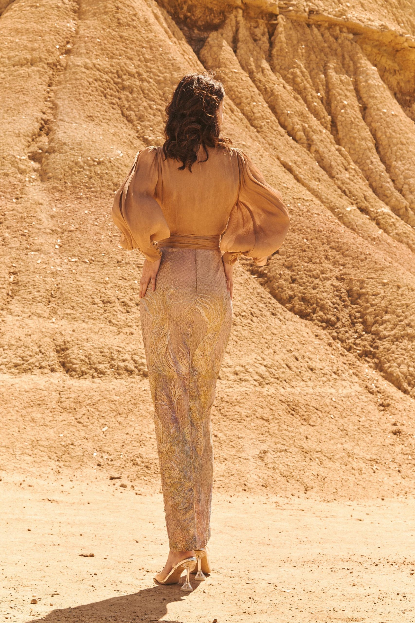 Espectacular vestido midi de fiesta con camisa, confeccionado en tul bordado con lentejuelas y gasa. Lleva un escote en forma de corazón, unos tirantes muy finos y una falda entallada desde la cadera y con forma de evasé en su terminación. Además lleva una camisa de gasa, cruzada que se abrocha detrás con una lazada, unas mangas abullonadas y unos puños abotonados. Un modelo elegante y estiloso con el que te sentirás perfectamente guapa en el día de tu evento especial. De la firma Española XYM.