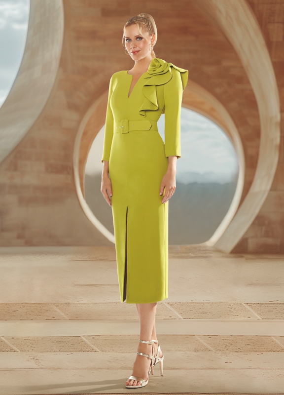 Asombroso vestido midi de líneas rectas, confeccionado en crepe. Lleva un escote a la caja con tul transparente, unas mangas largas con un bonito volante en el hombro, la falda recta con una abertura en el centro. Un modelo juvenil y moderno que te enamorará en cuanto te lo pruebes. De la firma de NATI JIMÉNEZ.