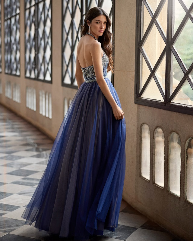 Espectacular vestido de fiesta largo y juvenil, de falda de tul y el cuerpo de pedrería. Lleva el cuello harter y una abertura lateral en la falda. Bonito y sensual modelo para destacar en cualquier fiesta. De la firma de MARFIL.