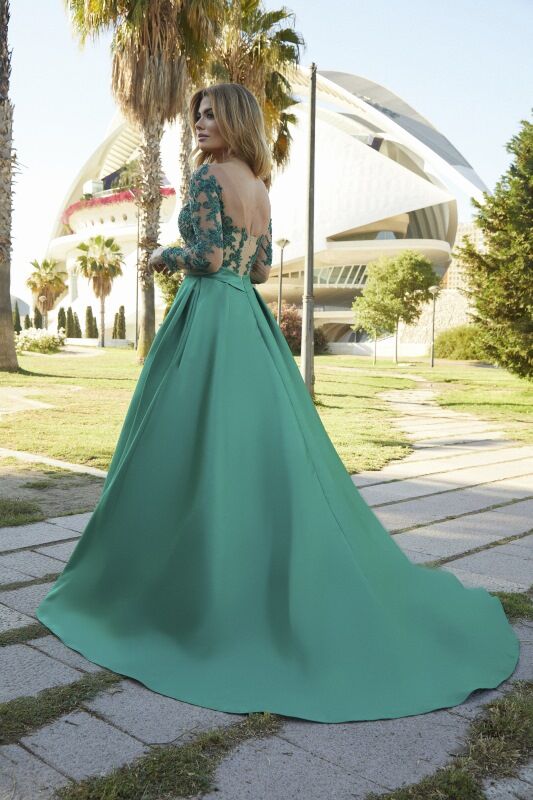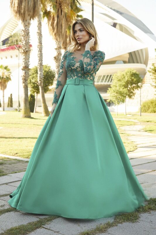 Espléndido vestido largo de madrina confeccionado de mikado y tul bordado. Lleva un bonito cuerpo de tul con bordados de encaje y cuello de barco, unas mangas francesas, un cinturón a juego de tela y una falda larga de mikado con tablas. Un modelo elegante y sofisticado para aquella persona que quiera destacar en su fiesta. De la firma de XYM.