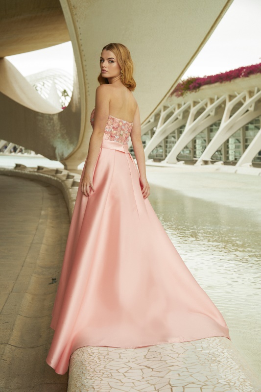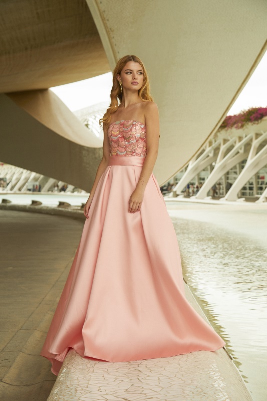 Asombroso vestido largo de fiesta confeccionado en mikado y lentejuelas. Lleva un bonito escote de palabra de honor de lentejuelas y una falda de tablas con vuelo, corte princesa. Un modelo elegante y juvenil con el que brillarás en tu fiesta. De la firma de XYM.