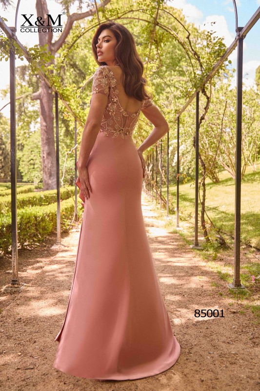 Espectacular vestido largo de madrina, confeccionado en crepé y tul bordado. Lleva un cuerpo de tul bordado haciendo como una flores, el escote es en forma de V y la espalda es abierta, unas finas mangas cortas y una falda larga con cola y con una abertura lateral que desciende desde por encima de la rodilla y tapándola un original pepblum. Un modelo lleno de elegancia y estilo con el que destacarás en cualquier evento. De la firma de X&M.