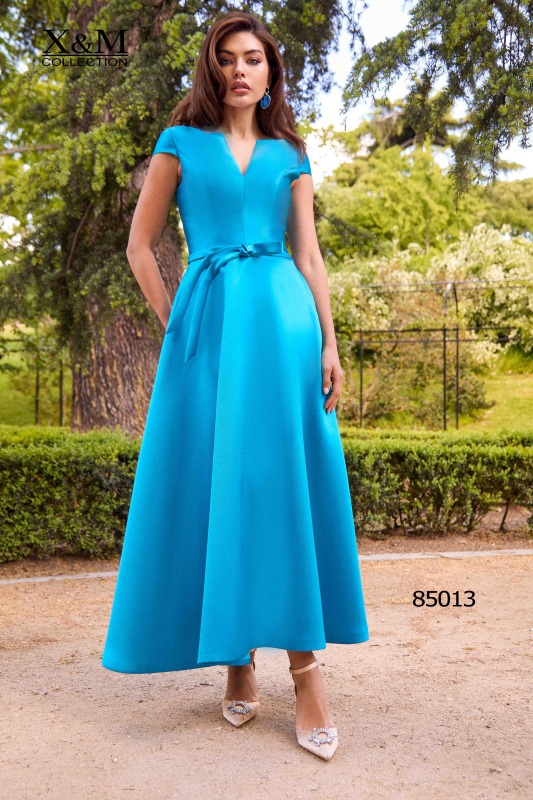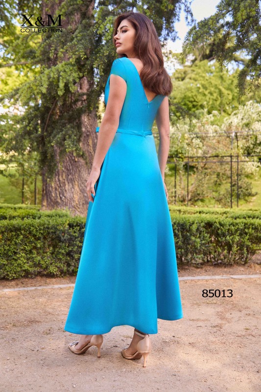 Espectacular vestido midi confeccionado en mikado. Lleva un cuerpo con escote y espalda en forma de V, una manguitas cortas tipo casquillo, una falda midi de capa muy graciosa y un cinturón estrecho con un lacito delante. Un modelo lleno de atractivo y muy estiloso para aquella persona que quiera ir elegante a un evento especial. De la firma de XYM.